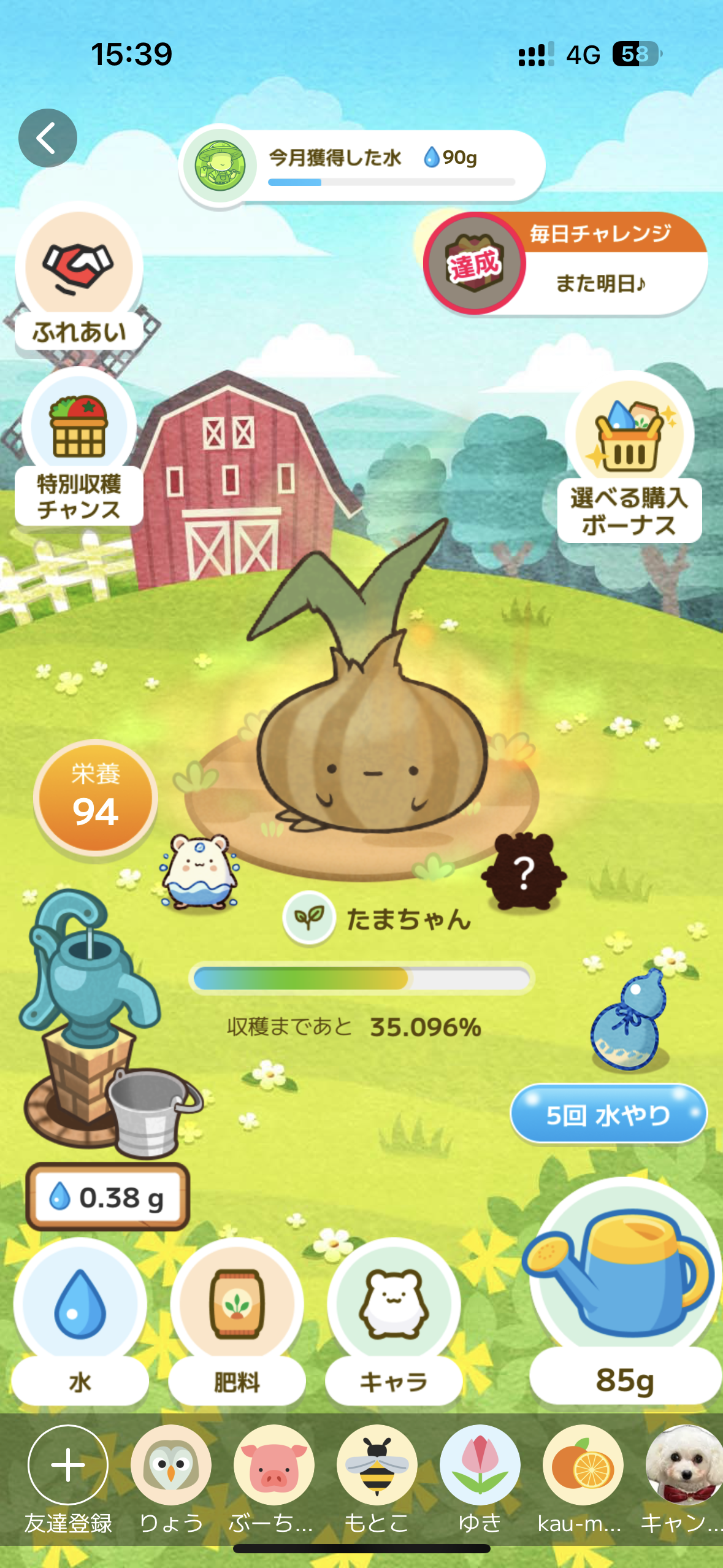 自分の水を使用した友達への水やりで肥料が貰え、友達へのあいさつで水が貰えます。