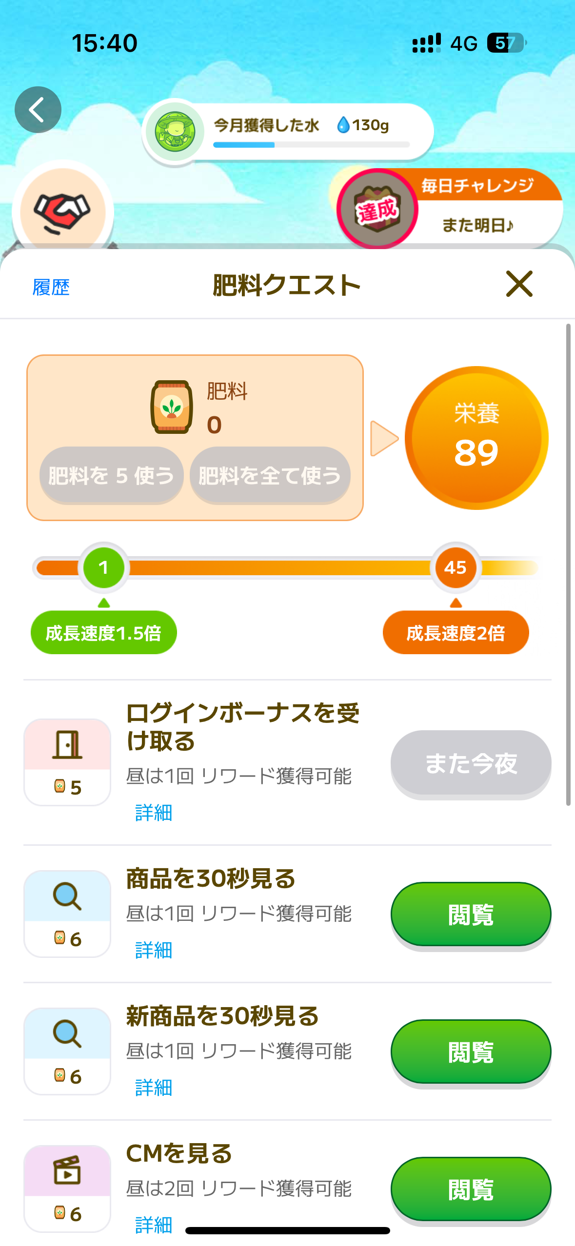肥料のクエストも水のクエストと似たもの。同じように広告動画を観るなどで肥料がもらえます。